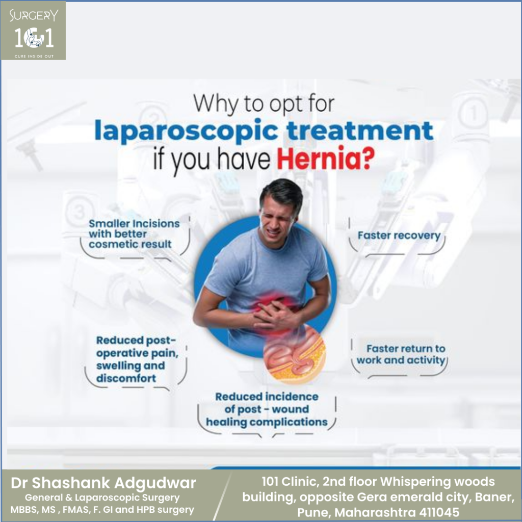 Hernias, which occur when an internal organ pushes through a weak spot in the surrounding muscle or tissue, are a common yet troublesome condition. Left untreated, hernias can lead to pain, discomfort, and even complications if they become strangulated. If you’re facing hernia surgery, laparoscopic surgery is a minimally invasive approach that offers numerous advantages over traditional open surgery. At The 101 Clinic, Dr. Shashank Adgudwar, an experienced specialist in laparoscopic surgery, provides advanced hernia treatment options to ensure a safer, quicker recovery.